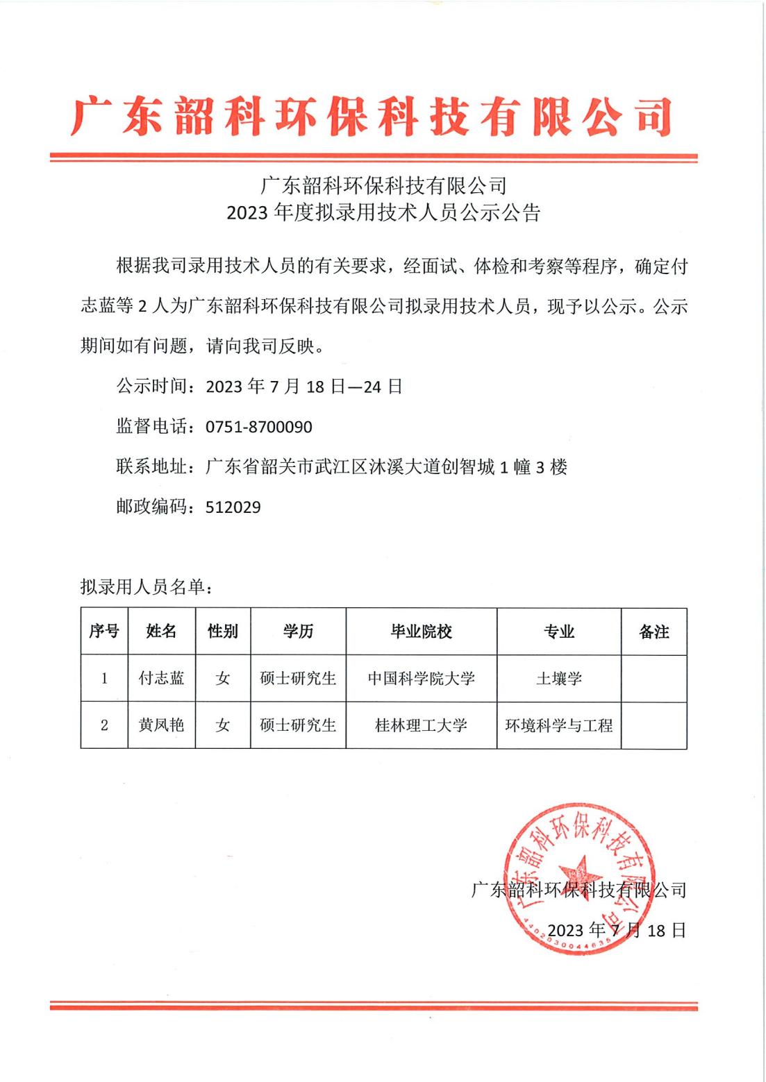 根據(jù)我司錄用技術(shù)人員的有關(guān)要求,經(jīng)面試、體檢和考察等程序,確定付志藍(lán)等2人為廣東韶科環(huán)??萍加邢薰緮M錄用技術(shù)人員,現(xiàn)予以公示。公示期間如有問(wèn)題,請(qǐng)向我司反映。